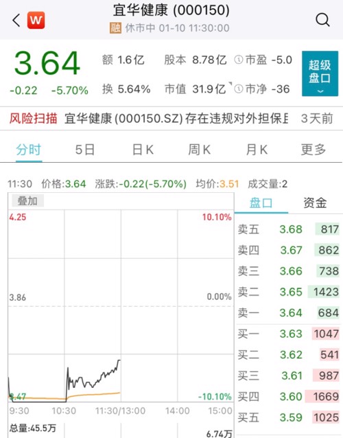 受消息影响,宜华健康今日早盘一度跌停,有网友表示,“果然是一字断魂刀。”不过随后宜华健康盘中撬开跌停板,截至午间收盘该股报3.64元,总市值31.9亿元。