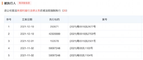 天眼查数据显示,宜华集团曾因未按时履行法律义务而被法院强制执行的案件近20件。