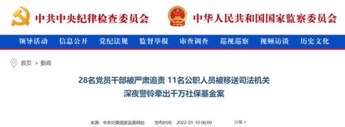 中央纪委国家监委网站1月10日信息显示,中央纪委国家监委公布了湖南省一起千万社保基金案的始末,28名党员干部被严肃追责, 11名公职人员被移送司法机关。