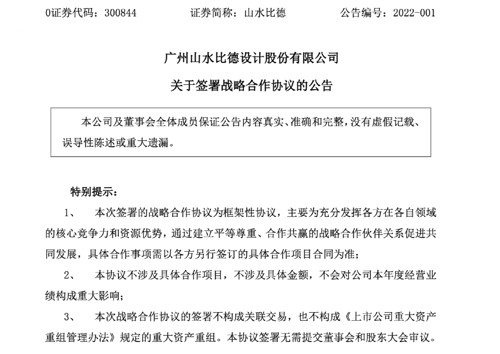 山水比德提示称,本次签署的战略合作协议为框架性协议,主要为充分发挥各方在各自领域的核心竞争力和资源优势,通过建立平等尊重、合作共赢的战略合作伙伴关系促进共同发展,具体合作事项需以各方另行签订的具体合作项目合同为准。本协议不涉及具体合作项目,不涉及具体金额,不会对公司本年度经营业绩构成重大影响。