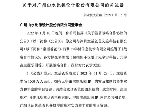 不过,上述战略合作协议同时也吸引了监管部门的关注。1月10日晚间,深交所向山水比德下发关注函,要求其说明公司及相关方是否存在热点炒作、违规买卖股票的行为。