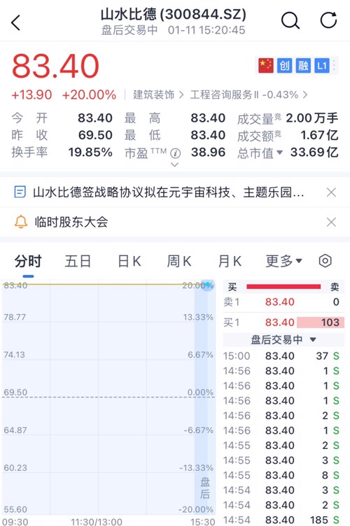 不过,山水比德却无惧关注函,今日开盘20CM涨停,并一直持续到收盘。截至收盘,该股报83.4元,总市值为33.7亿元。