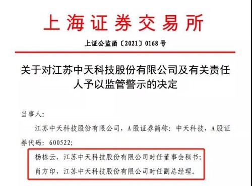 1月11日晚间,中天科技董秘被上交所予以监管警示,原因则是公司高管在机构交流会上交流内容违规,而董秘没有进行劝阻。