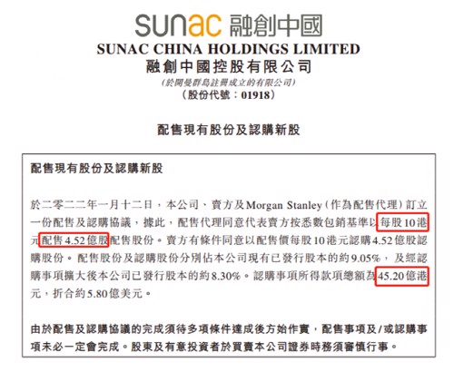 1月13日早间,融创中国发布配售现有股份及认购新股公告。公告显示,融创中国控股股东以每股10港元配售4.52亿股配售股份,并有条件同意以配售价每股10港元认购4.52亿股认购股份。