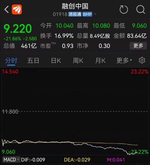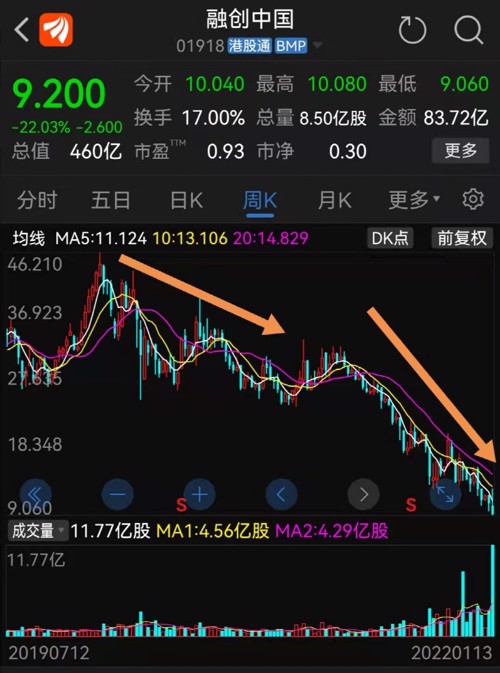 中国基金报记者注意到,融创中国自从2010年10月在香港上市以来,从未发生如此大的单日跌幅,22%的下跌幅度创造了上市12年的历史。而融创股价从2020年初的近50港元高位算起,不到两年时间跌幅已经超过80%,市值缩水至不到500亿港元。
