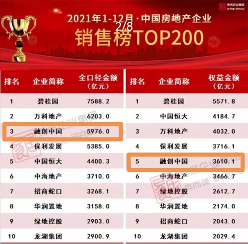根据克尔瑞的排名,全口径金额算,融创中国销售额排名行业前三,仅次于碧桂园和万科,按权益口径算,则排名第五。
