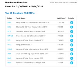 1月10日至1月14日,美国超过2000只ETF中, 10只ETF吸金最多。一只中国股票ETF上榜。这只由中金公司旗下的金瑞基金发行的中国互联网ETF KWEB 2021年大跌超过50%,美国投资者却一路抄底把它抄成了美国最大中国股票ETF。