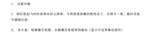另有网友认为2021年投资得出了三条经验(教训)。一是远离中概、二是网红股起飞的时候设好止损单,不然就是到嘴的肥肉没了,还得亏一笔。当然,他(她)认为最好还是根本不碰网红股。第三就是买大盘。