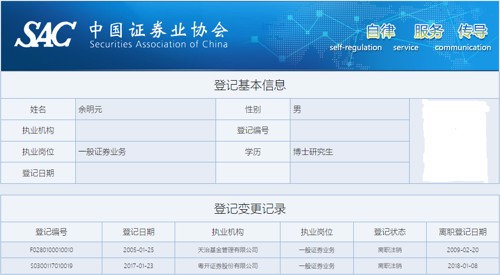 证券业协会信息显示,余明元此前曾先后供职于天治基金、粤开证券两家金融机构。