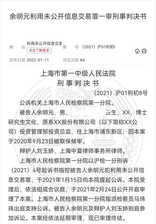 据上海市第一中级人民法院刑事判决书披露,上海市人民检察院第一分院以沪检一分刑诉(2021)4号起诉书指控被告人余明元犯利用未公开信息交易罪,于2021年1月15日向上海市第一中级人民法院提起公诉。