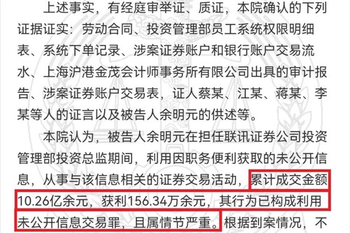 近日,一则刑事判决书披露了联讯证券公司前任投资管理部投资总监余明元在任职期间,利用掌握的未公开信息,指令他人操作多个其实际控制的证券账户,先于、同期或稍晚于公司证券账户买入或卖出62只相同的股票,累计交易金额人民币10.26亿余元,非法获利合计156.34万余元。
