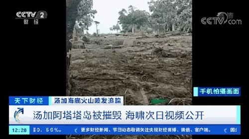 美联社21日公开的视频显示,海底火山喷发并引发海啸后,汤加阿塔塔岛“大量建筑物消失”,整个小岛被摧毁。