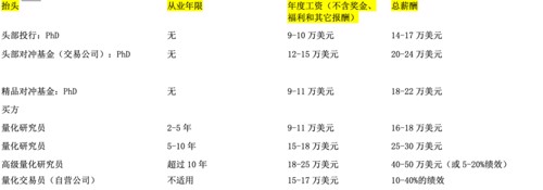 Selby Jennings 在报告中给出了北亚地区2022年量化机构的薪酬指引。据指引,刚毕业的PhD的进入一家头部对冲基金年度可期待20-24万美元的总薪酬。这表明,尽管不同公司差异较大,但仍有部分PhD毕业第一年就能获得相当于百万元人民币的年薪。