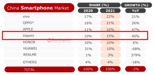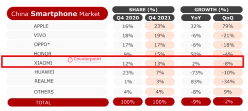 昨日(1月26日),Counterpoint发布2021年四季度国内手机市场销量报告,小米排名第五,销量同比下滑8%。