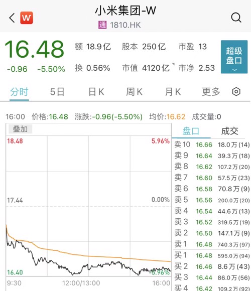 今日盘中,小米股价一度跌近6%,报16.40港元/股,已经跌破17港元发行价,与此同时该股价刷新了近52周来最低。截至收盘,股价跌5.5%,报收16.48港元/股,最新市值4120亿港元。
