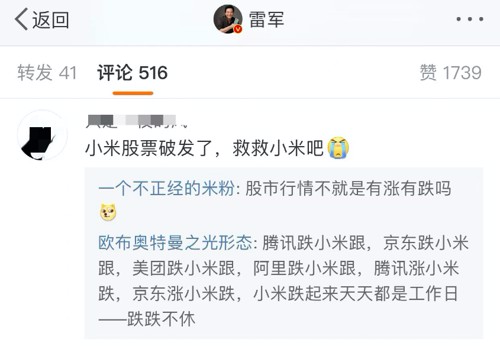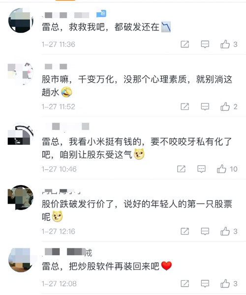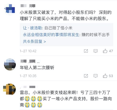 有股民留言:“小米股票破发了,救救小米吧”,“腾讯跌小米跟,京东跌小米跟,美团跌小米跟,阿里跌小米跟,腾讯涨小米跌,京东涨小米跌,小米跌起来天天都是工作日——跌跌不休”。还有股民表示,“年轻人第二次腰斩”,“小米股票又破发了,对得起小股东们吗?深刻的理解了只能买小米的产品,不能做小米的股东。” 另有股民透露了自己炒小米大亏三四十万。“雷总,小米股价要支棱起来啊!亏了三四十万了都,买了一堆小米产品支持,股价一路向南”。