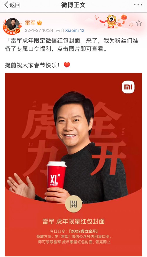 今日,雷军个人发布微博称:“‘雷军虎年限定微信红包封面’来了,提前祝大家春节快乐!”没多久,其个人微博就被‘小米破发’的留言刷屏。