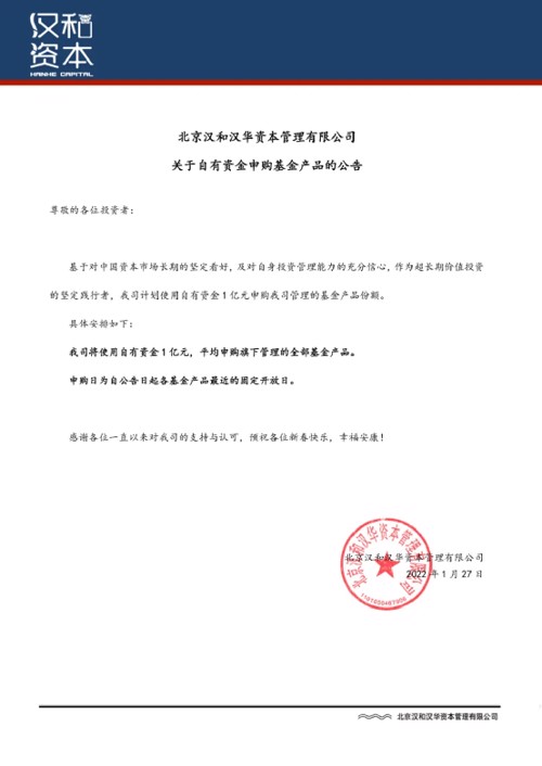 1月27日,百亿私募汉和资本发布公告称,基于对中国资本市场长期的坚定看好,及对自身投资管理能力的充分信心,作为超长期价值投资的坚定践行者,汉和资本计划使用自有资金1亿元,平均申购旗下管理的全部基金产品。申购日为自公告日起各基金产品最近的固定开放日。