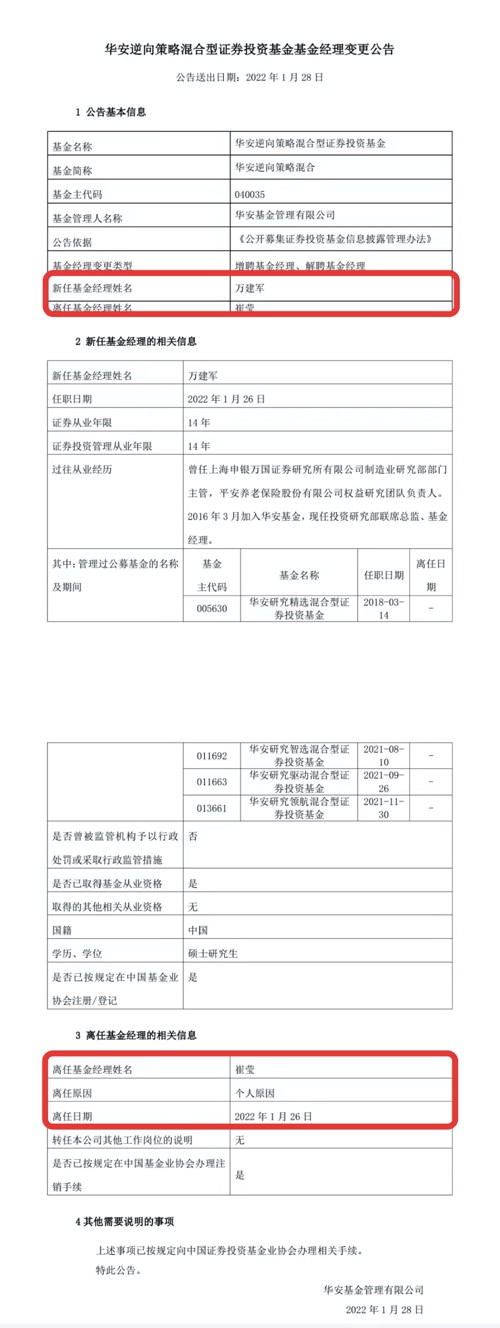 1月28日,华安基金发布多份基金经理变更公告,崔莹正式离任其所管的华安逆向策略、华安创新、华安幸福生活等5只基金。