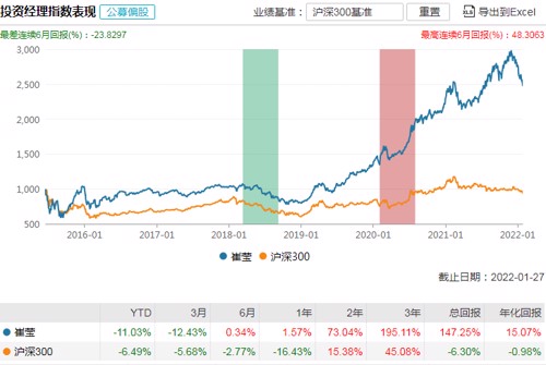 2015年6月18日,上证指数4967.90点,正是上一轮牛市的顶点,从那一天到2022年1月26日离职,上证指数跌幅超过了30%,崔莹高位进场接手管理了他的第一只基金——华安逆向策略,经历这一波牛熊转换,他在任职期间依旧取得回报181.34%,年化回报达到16.92%。