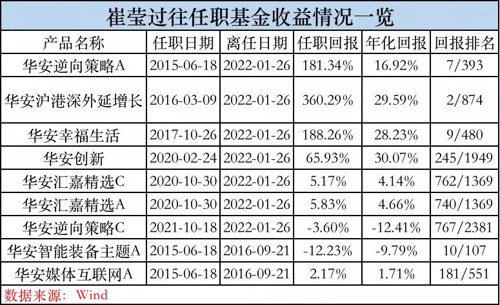 在离职前,崔莹担任华安基金基金投资部总监。管理包括华安逆向策略、华安沪港深外延增长、华安幸福生活、华安创新、华安汇嘉精选在内五只产品。