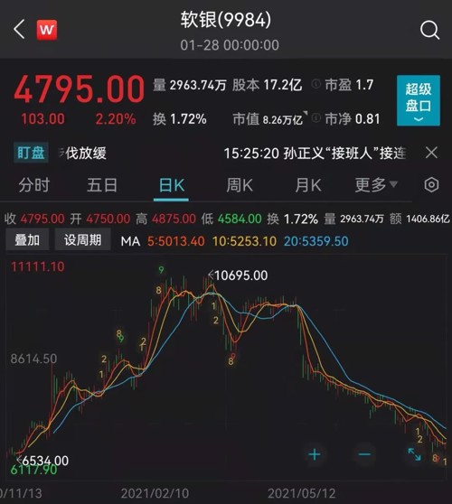 与此同时,软银旗下的重要资产负面消息不断。如软银愿景基金投资的滴滴出行宣布在美国退市,中国互联网巨头阿里巴巴接受更严厉的反垄断审查等。随着滴滴和阿里巴巴的股价不断下探,软银持有的股票市值也大幅缩水。