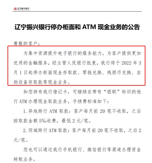 无独有偶,1月初,辽宁振兴银行也发布行停办柜面和 ATM 现金业务的公告。称为集中资源提升电子银行的服务能力,为客户提供更加优质的金融服务,经主管人民银行批复,该行将于2022年3月1日起停办柜面现金存取款、零钱兑换、残损币兑换、自助设备存取款等现金业务。您也可以通过该行手机银行、微信银行等渠道办理资金转账业务。