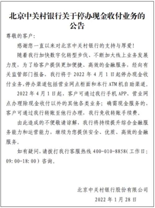 1月28日,北京中关村银行发布公告称,随着其加快数字化转型步伐、不断加大线上业务发展力度,为了给客户提供更加便捷、高效的金融服务,经向有关监管部门报备,其将于2022年4月1日起停办现金收付业务,停办渠道包括营业网点柜面和ATM机自助渠道。
