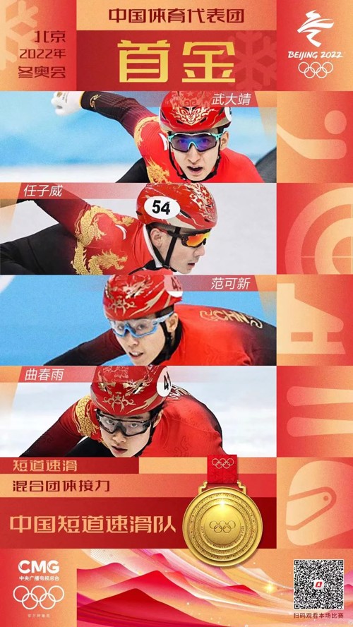 据中国新闻网,在5日晚结束的短道速滑混合团体接力决赛中,由武大靖、任子威、范可新、曲春雨组成的中国队率先冲过终点,为中国体育代表团拿到本届冬奥会首枚金牌。
