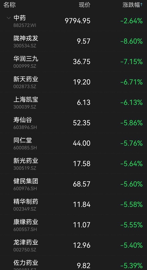 华润三九、华森制药、特一药业、新光药业、新天药业、龙津药业等也领跌。