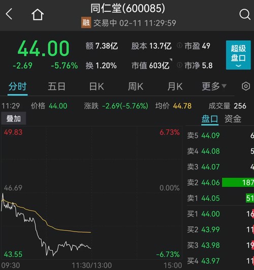 600亿同仁堂一度跌近7%,收跌5.76%。