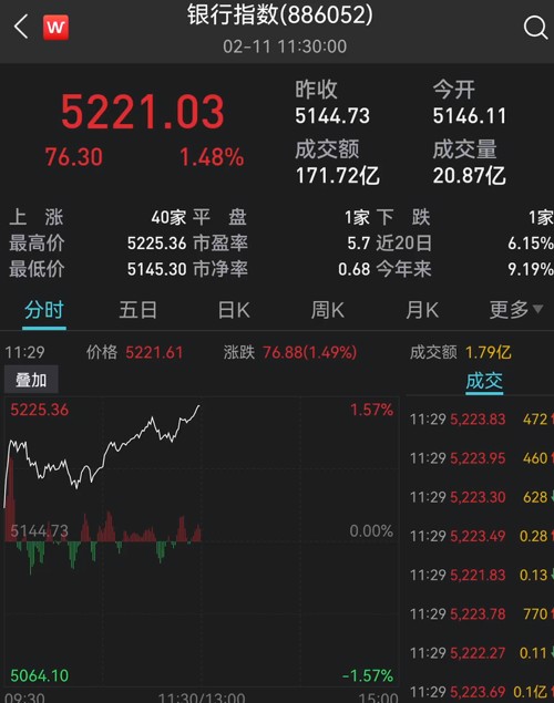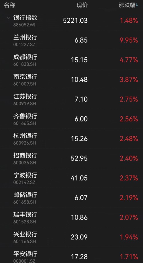 此外,各大金融板块集体上扬。银行指数涨近1.5%,兰州银行领涨,平安银行、招行也跟涨。