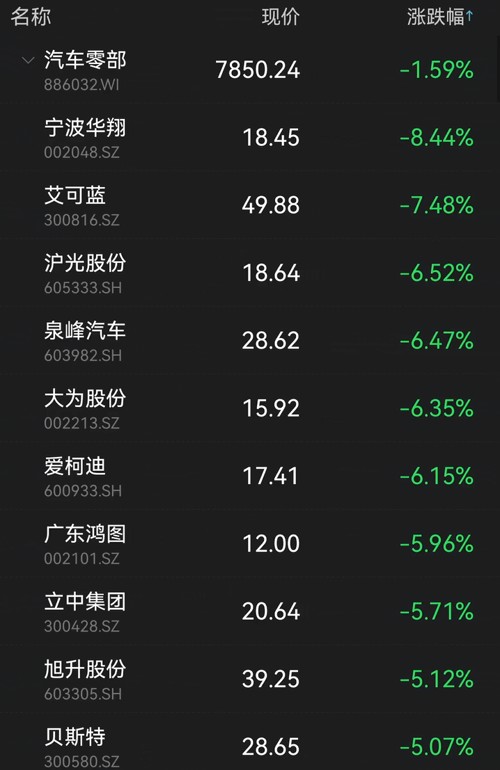 汽车板块集体回调,汽车零部件板块震荡走低,宁波华翔一度跌停,伯特利、爱科迪、无锡振华跌超5%,上声电子、广东鸿图、泉峰汽车等跟跌。