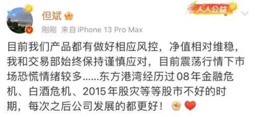 对此,但斌在其微博中回应称:“目前我们产品都有做好相应风控,净值相对维稳,我和交易部始终保持谨慎应对,目前震荡行情下市场恐慌情绪较多……东方港湾经历过2008年金融危机、白酒危机、2015年股灾等等股市不好的时期,每次之后公司发展得都更好!”
