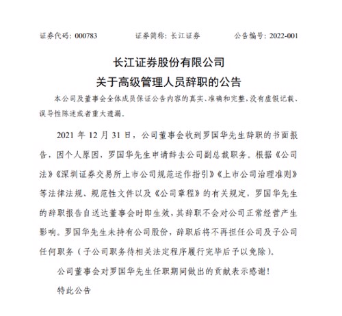 不过,2021年12月31日,长江证券披露,该公司董事会收到罗国华先生辞职的书面报告,因个人原因,罗国华申请辞去该公司副总裁职务,辞职报告自送达董事会时即生效。
