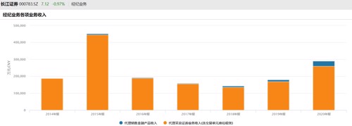 根据Wind数据显示,在经历了2015年的高光时刻之后,长江证券的经纪业务在经历了近3年的下滑之后,从2019年起逐步回升。并在2020年实现37.4亿元的营收,占总营收的48%。