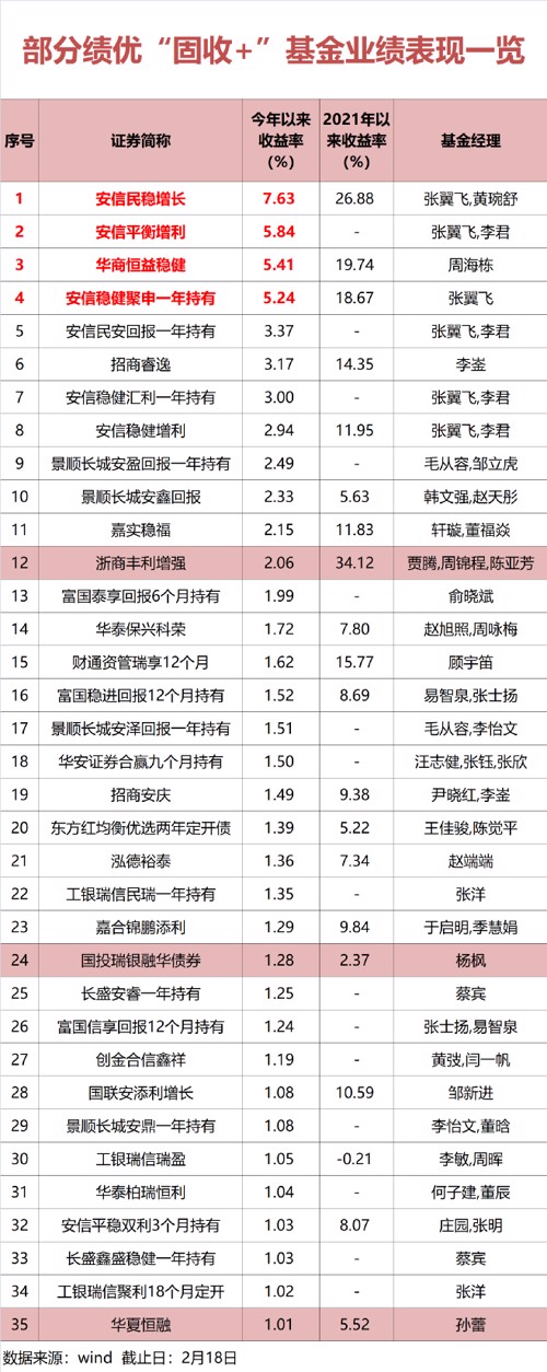数据显示,截至2月18日,“固收+”基金中有198只在今年斩获正回报,收益率最高的安信民稳增长,今年以来斩获7.63%的正收益,比排名最后的产品首尾业绩相差21.15个百分点。另外,安信平衡增利、华商恒益稳健等多只“固收+”基金,今年收益率也超5%。