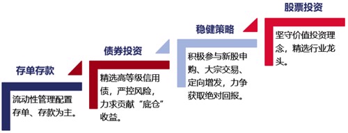 国泰通利采取“固收+”的策略稳健投资,以流动性管理和债券投资构建“安全垫”底仓收益,以股票投资追求超额收益,以新股申购、定增等稳健投资品种力争增厚收益。
