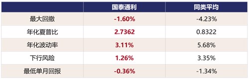 其他风险指标方面,无论是夏普比率,还是年化波动率、下行风险和最低单月回报等指标,国泰通利均显著优于同类平均水平。