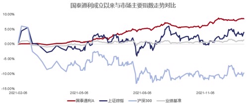 2021年以来,A股市场持续震荡,国泰通利自成立以来却取得了8.55%的亮眼收益,净值走势稳健向上,显著跑赢同期业绩比较基准和大盘指数。同期上证综指仅上涨3.94%,沪深300指数下跌9.75%。