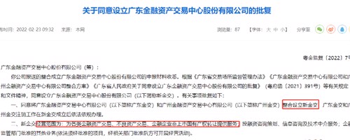 2月23日,广东省地方金融监督管理局官网挂出批复公告,同意将广东金融资产交易中心有限公司和广州金融资产交易中心有限公司整合设立广东金融资产交易中心股份有限公司。新金交定位为省级地方金融基础设施,而广东金交和广州金交将在新金交成立后注销。