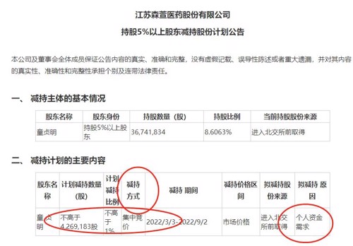 在2月10日,森萱医药持股5%以上的股东童贞明宣布减持,该股东持股股份刚在今年1月底限售股解禁。童贞明持股3674.18万股,占股本比为8.6%,拟减持不超过426.92万股。减持理由是个人资金需求。