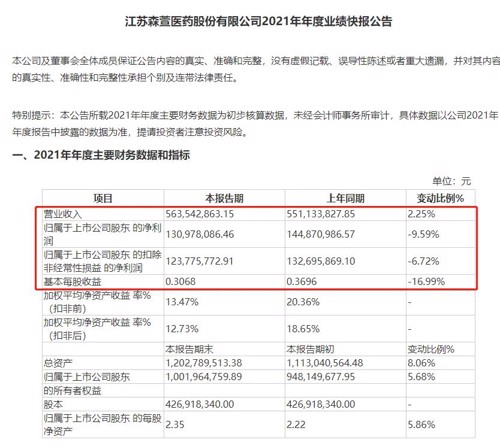 森萱医药业绩快报显示,公司2021年实现营业收入5.64亿元,同比增长2.25%;归母净利润为1.31亿元,同比下降9.59%;扣非后利润利润为1.24亿元,同比下降6.72%;预计基本每股收益为0.3068元/股,同比下降16.99%。