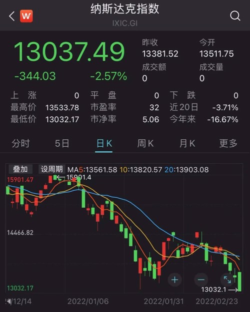 以科技股为主的纳斯达克综合指数下跌2.57%,至13037.49点。