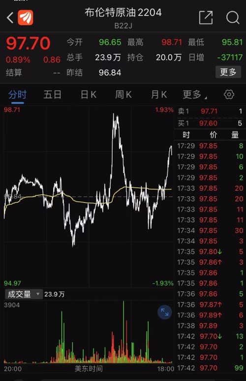 受俄、乌紧张局势加剧的影响,原油涨势也很好,但临近尾盘,因美国可能释放石油储备的消息,原油冲高回落。从全天走势来看,收盘时美油、布油均收涨。