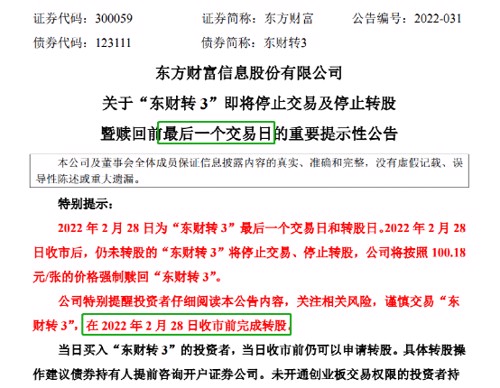 2月26日,东方财富发出可转债“东财转3”强制赎回前的最后一次提示公告。