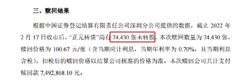 最近一只强赎的正元转债,截至最后交易日(2月17日)收盘,仍有74430张转债未转股,按照2月17日正元转债收盘价162.88元/张计算,涉及的市值约1200万元。而正元转债的赎回价格为100.67元/张,未转股的1200万资金直接折损约38%,折损资金超过450万元。