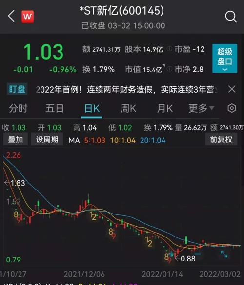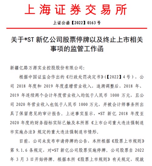 3月2日,*ST新亿收到了上交所下发的《关于*ST新亿公司股票停牌以及终止上市相关事项的监管工作函》(下称《监管工作函》),《监管工作函》称,根据中国证监会作出的《行政处罚决定书》,公司2018年度和2019年度虚增营业收入,追溯调整后,2018年、2019年连续两个会计年度营业收入均低于人民币1000万元,且公司2020年营业收入也低于人民币1000万元,并被会计师事务所出具了保留意见的审计报告。上述事实显示,*ST新亿2018年度至2020年度的财务指标实际已触及上交所原《上市公司重大违法强制退市实施办法》规定的重大违法强制退市情形。
