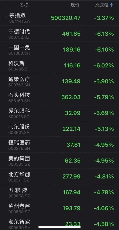 茅指数也大跌3.37%,中国中免、美的集团、五粮液等也大跌。