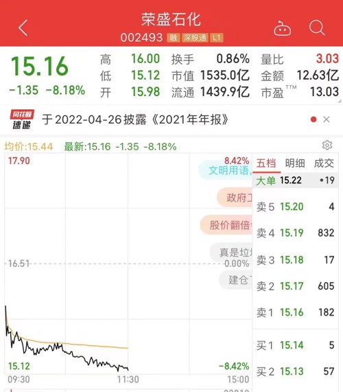 原油作为上游材料的石化股,两大千亿级巨头荣盛石化、恒力石化上午又暴跌。